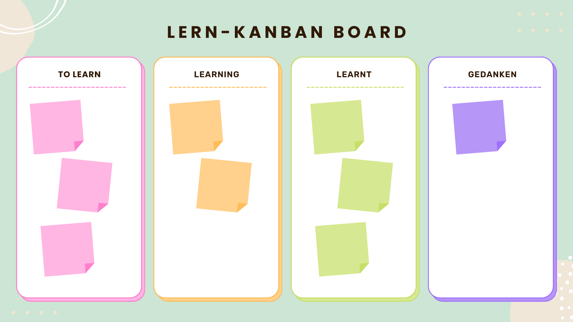 Diese Materialien werden in einem Lern-Kanban-Board in der “To Learn” Spalte notiert und auf einzelne Lernsprints verteilt. Die Sprintlänge lässt sich dabei variabel auf die Situation der Lernenden und deren Auslastung im Arbeitsalltag anpassen.